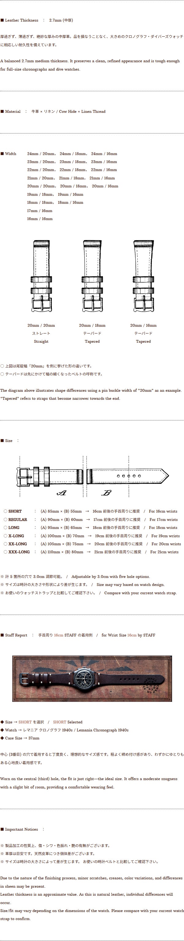 パターンは1940年代にドイツ空軍で採用されていたストラップをベースとしたモデル。やや厚みのある中厚革を使用した *ライトヘビー は、大きめのクロノグラフ、パイロットウォッチ、ダイバーズウォッチには最適のストラップ。古い時計、現行時計を問わず好相性です。
